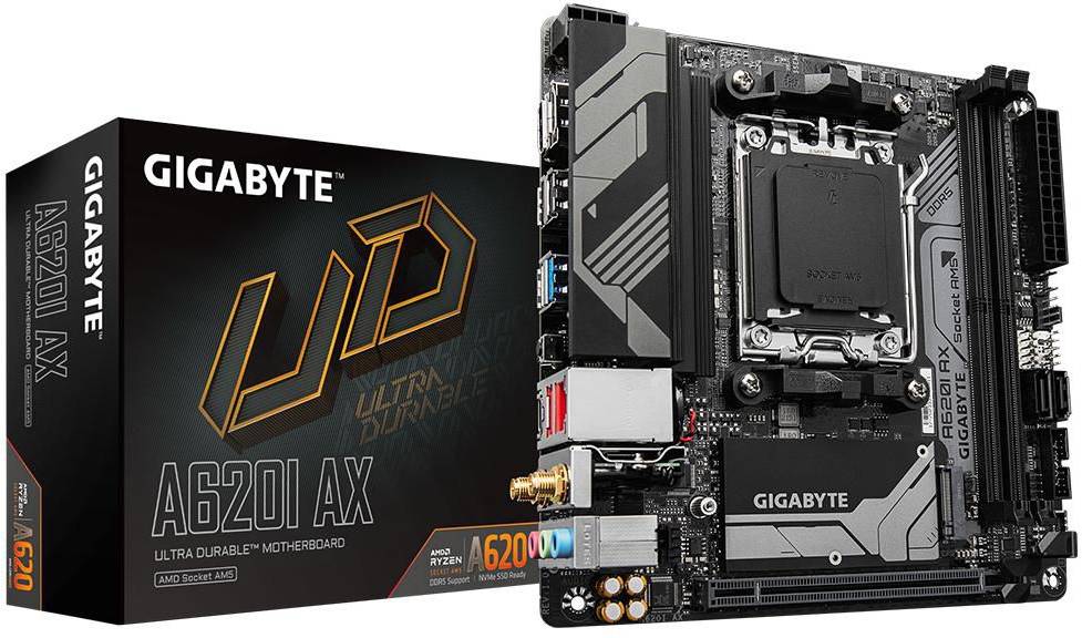 Gigabyte A620I AX, AMD AM5, Mini-ITX, 2xDDR5, M.2 + SATA3 RAID, HDMI/DP, USB-C, 2.5Gbe LAN, WiFi 6E, Bluetooth 5.3, RGB Fusion