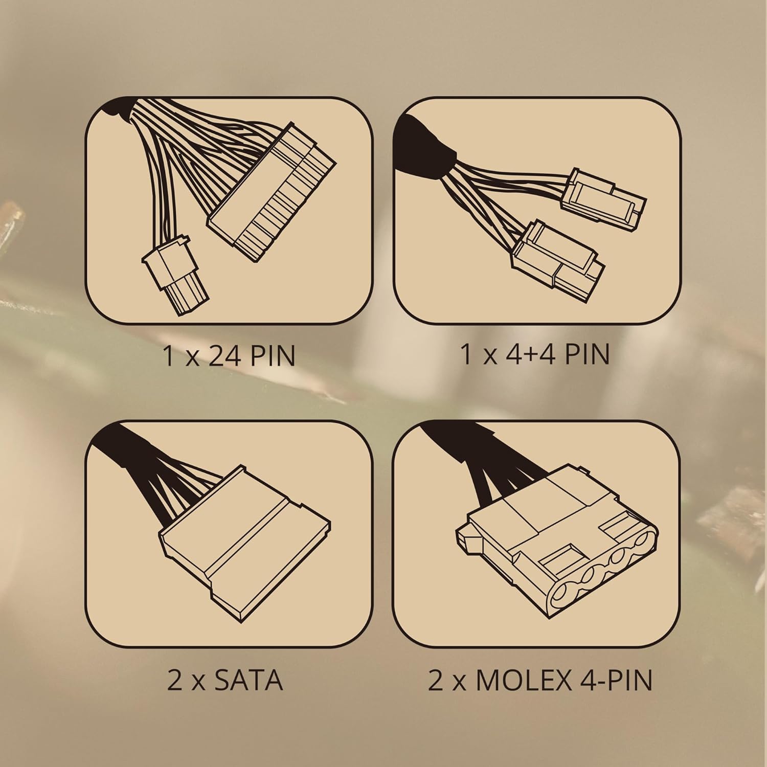 HELSVARTA KABLAR OCH HÖLJE: Helt svart finish med långa, svarta, platta kablar av hög kvalitet utformade för maximal kompatibilitet och bekväm installation, och inkluderar 1x ATX MB 24 PIN-kontakter, 1x EPS +12V 4+4 PIN, 2x SATA, 2x Molex 4 PIN-kontakter; *Den här strömförsörjningen inkluderar inte PCIe-kontakt för grafikkort; Kontrollera om ditt grafikkort behöver det; Inget läge; verifiera eller installera adaptrar till strömförsörjningskablar.