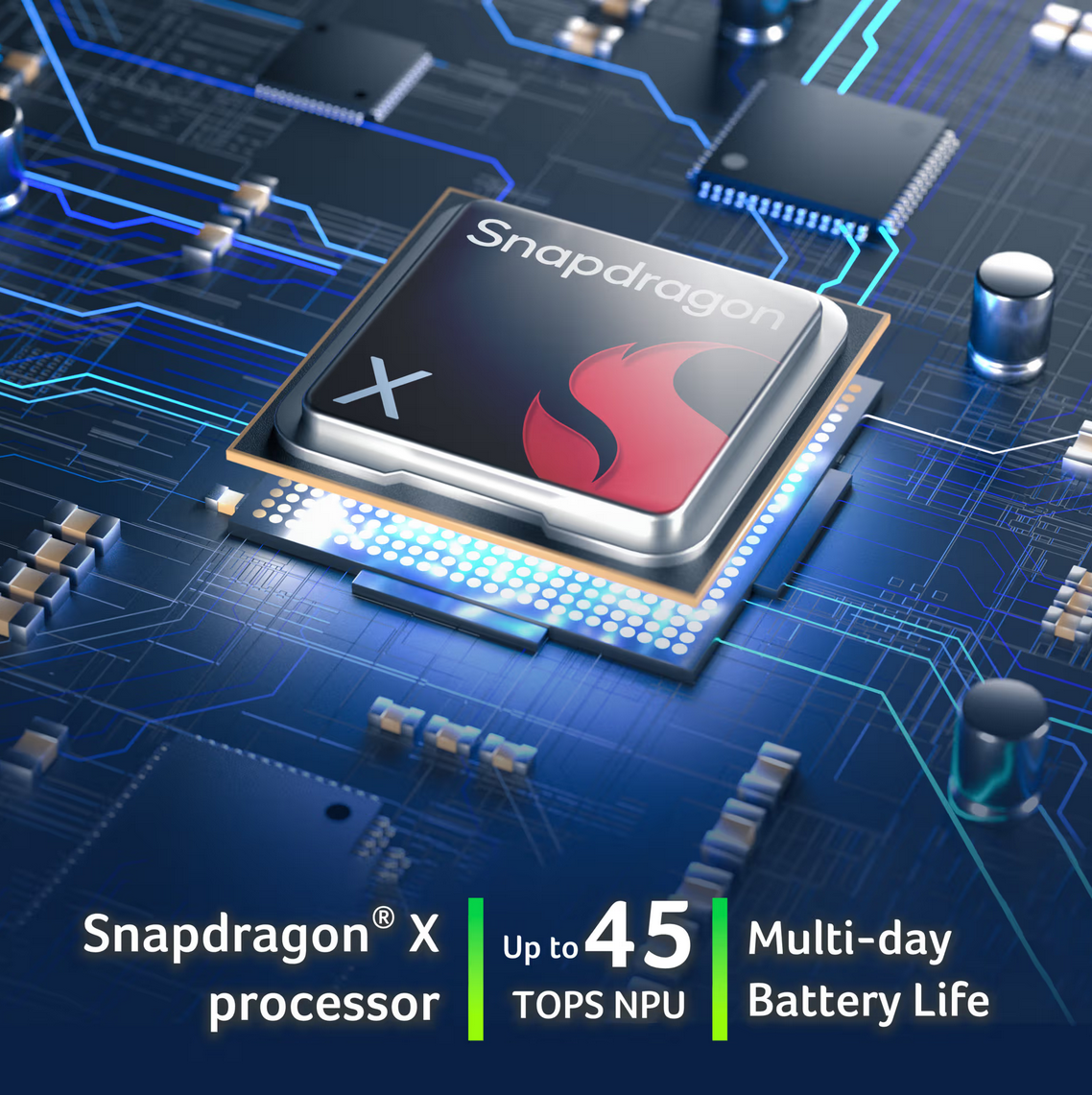 Snapdragon X CPU med 8 kärnor säkerställer effektiv multitasking och smidig drift.