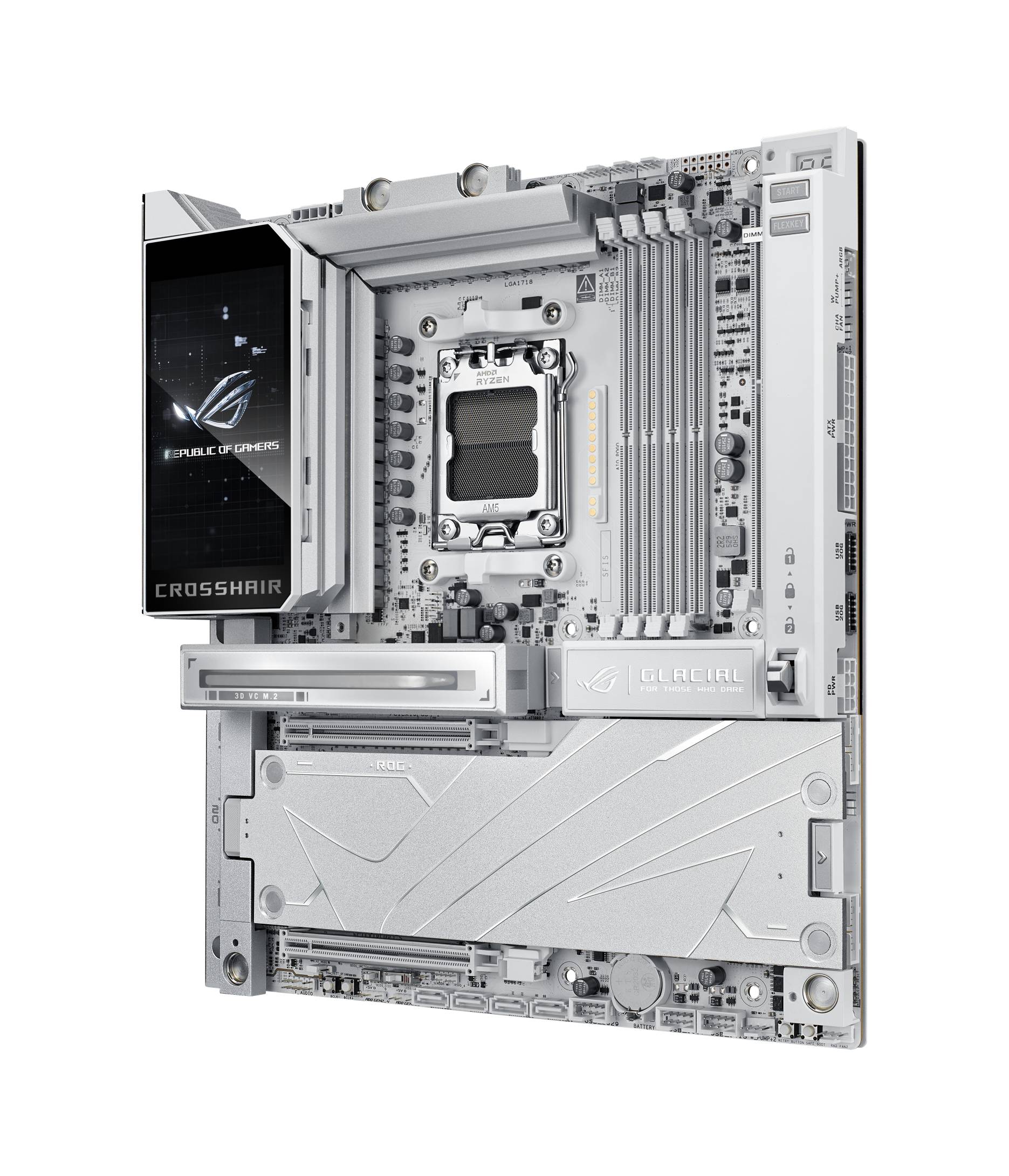 Asus ROG Crosshair X870E GLACIAL, AMD Socket AM5, ATX, 4xDDR5, 6xPCI Express, 7xM.2 + SATA3 RAID, HDMI/2xUSB4, ROG SupremeFX 7.1 audio, 2x10GbE LAN, WiFi 7, Bluetooth 5.4, Aura Sync RGB