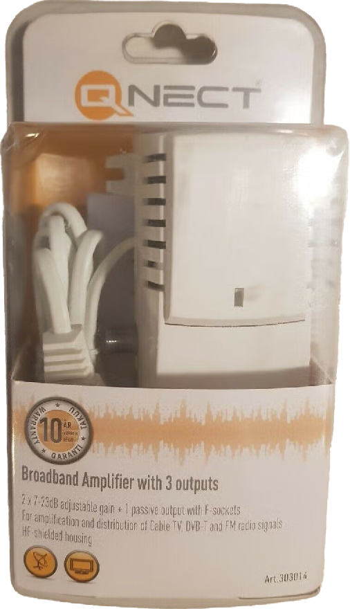 Bredband förstärkare med 3 utgångar och retur, Kabel-Tv, DVB-T, Fm-Radio