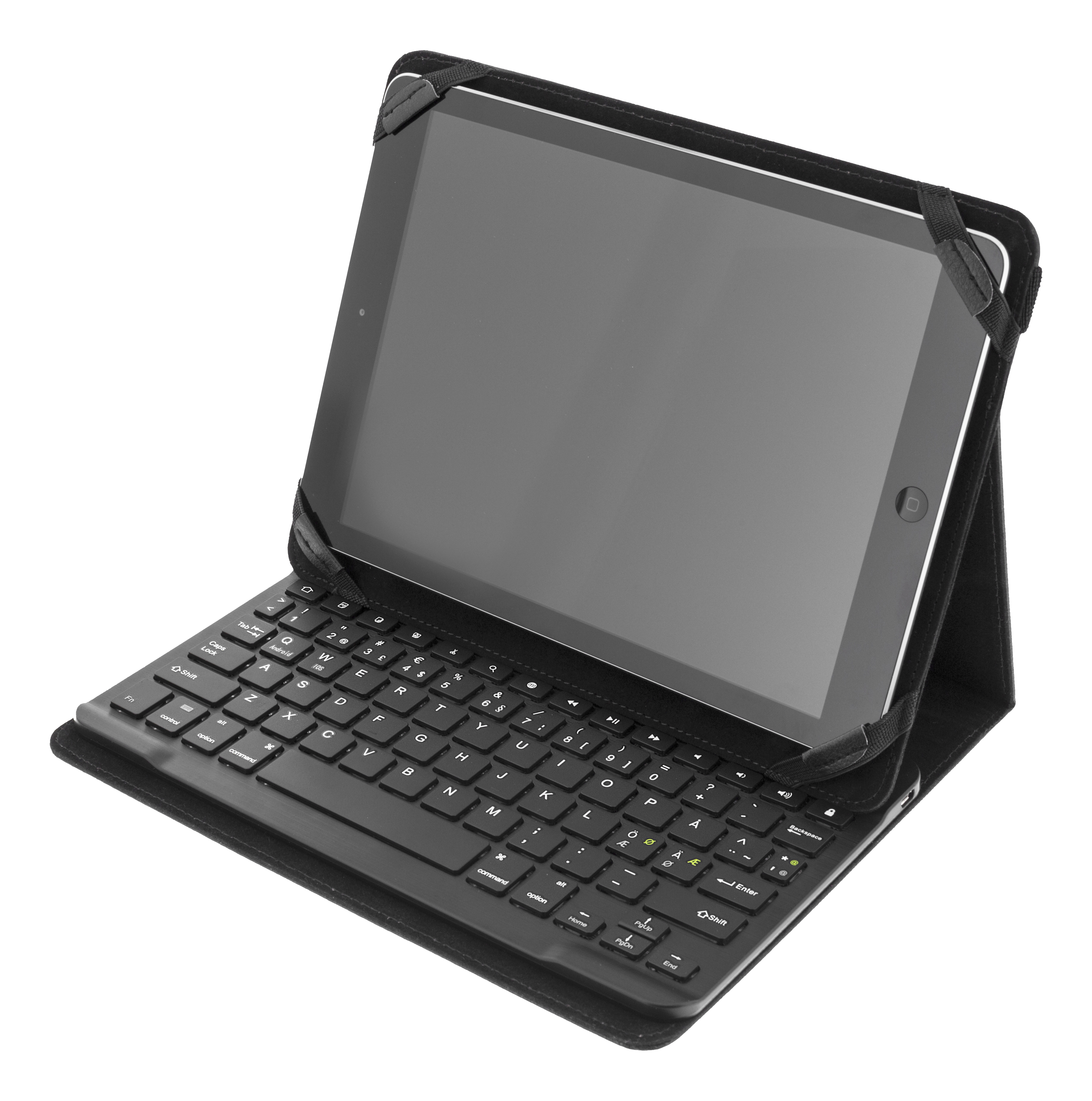 Fodral och tangentbord till din surfplatta. Inte nog med att du får ett praktiskt och snyggt fodral i konstläder som skyddar din suftplatta, du får även med ett ultratunt tangentbord i aluminium. Tangentbordet har ett inbyggt batteri och laddas via medföljande USB-kabel.