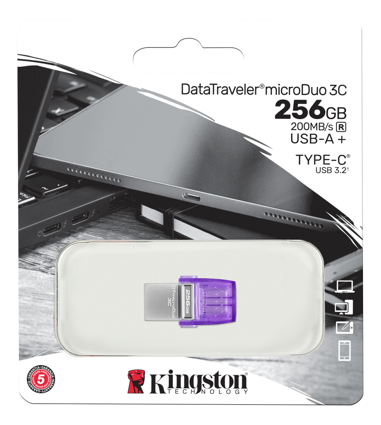 DataTraveler® microDuo™ 3C har ett dubbelt gränssnitt som fungerar med både nyare USB Type-C®* och traditionella USB Type-A-portar. Det är ett perfekt sätt att frigöra utrymme på din smartphone eller surfplatta med upp till 256GB extra lagringsutrymme för dina foton och videor. Den iögonfallande formfaktorn erbjuder bekväm plug and play-anslutning. Överför filer snabbt mellan dina enheter med USB 3.2 Gen 1-hastigheter på upp till 200 MB/s läsning. Oavsett om du är på resande fot (OTG) för arbete, resor eller bara ute och fångar ögonblicken, är DT microDuo 3C den perfekta kompakta följeslagaren för att säkerhetskopiera, lagra mer och ta med dig vart du än går.