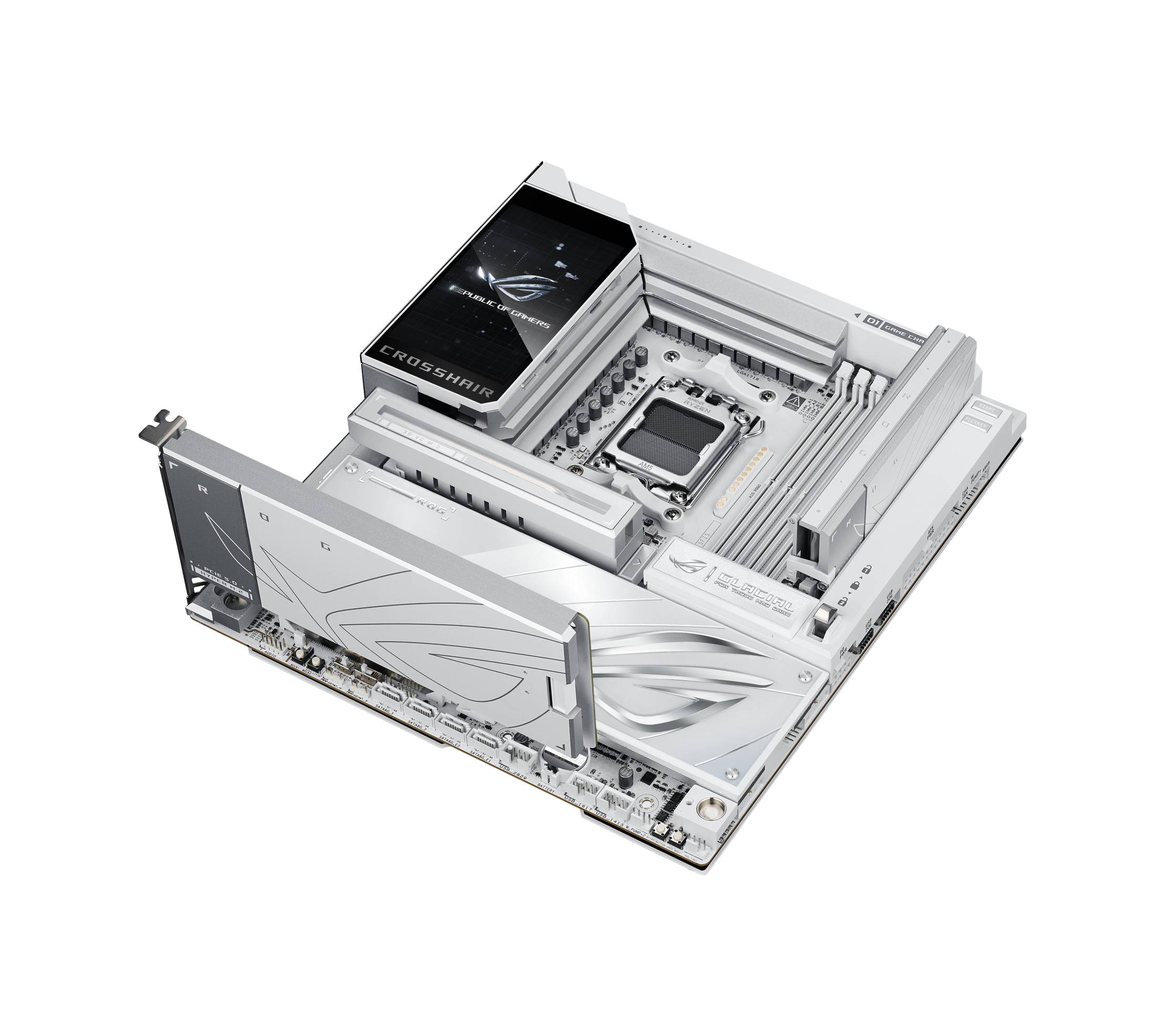 Asus ROG Crosshair X870E GLACIAL, AMD Socket AM5, ATX, 4xDDR5, 6xPCI Express, 7xM.2 + SATA3 RAID, HDMI/2xUSB4, ROG SupremeFX 7.1 audio, 2x10GbE LAN, WiFi 7, Bluetooth 5.4, Aura Sync RGB