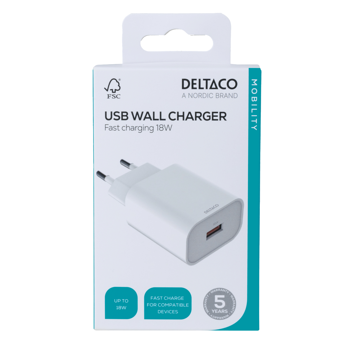 Deltaco USB wall charger, 1x USB-A, fast charging 18 W - Vit